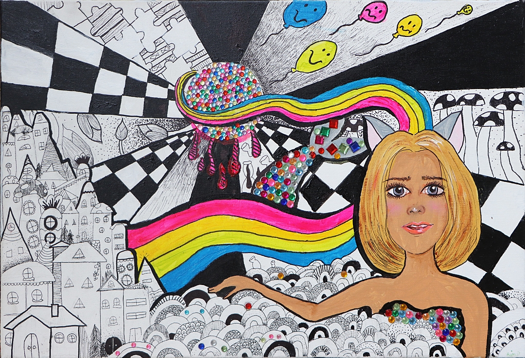 I was inspired for this piece by a fictional beautiful woman who came up from the ocean and enjoyed the view. It was such a beautiful day and in the town everyone has their own unique house. The planet in the background was inspired by the planet Saturn, with an explosion of color to help celebrate my birthday.